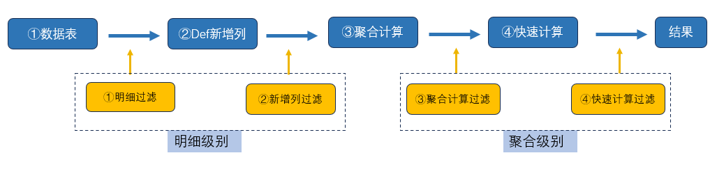 FineBI中的计算顺序大致分为四个层级,过滤操作可以在不同的层级进行,从而影响最终的计算结果。1