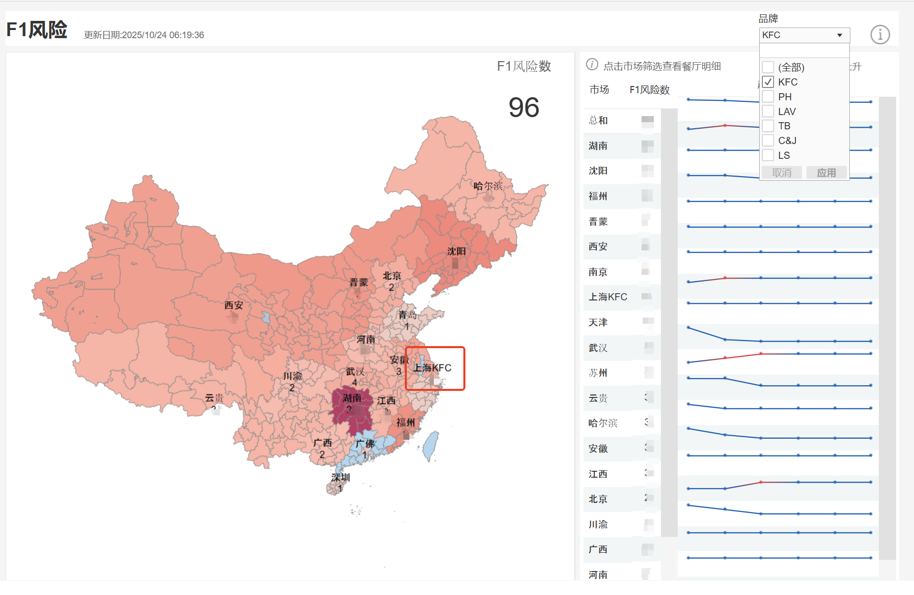 我想实现以下效果,地图上面有一个筛选框。里面可以选KFC、PH、LAV等品牌。当选择KFC的时候,上海显示的是上海KFC(只包含了上海市)。当选择PH的时候,上海显示上海PH(包含上海、苏州、无锡、南通等江苏的部分城市)。详细效果请见截图,请问怎么实现这种动态选择不同的地图,还有地图区域自定义?