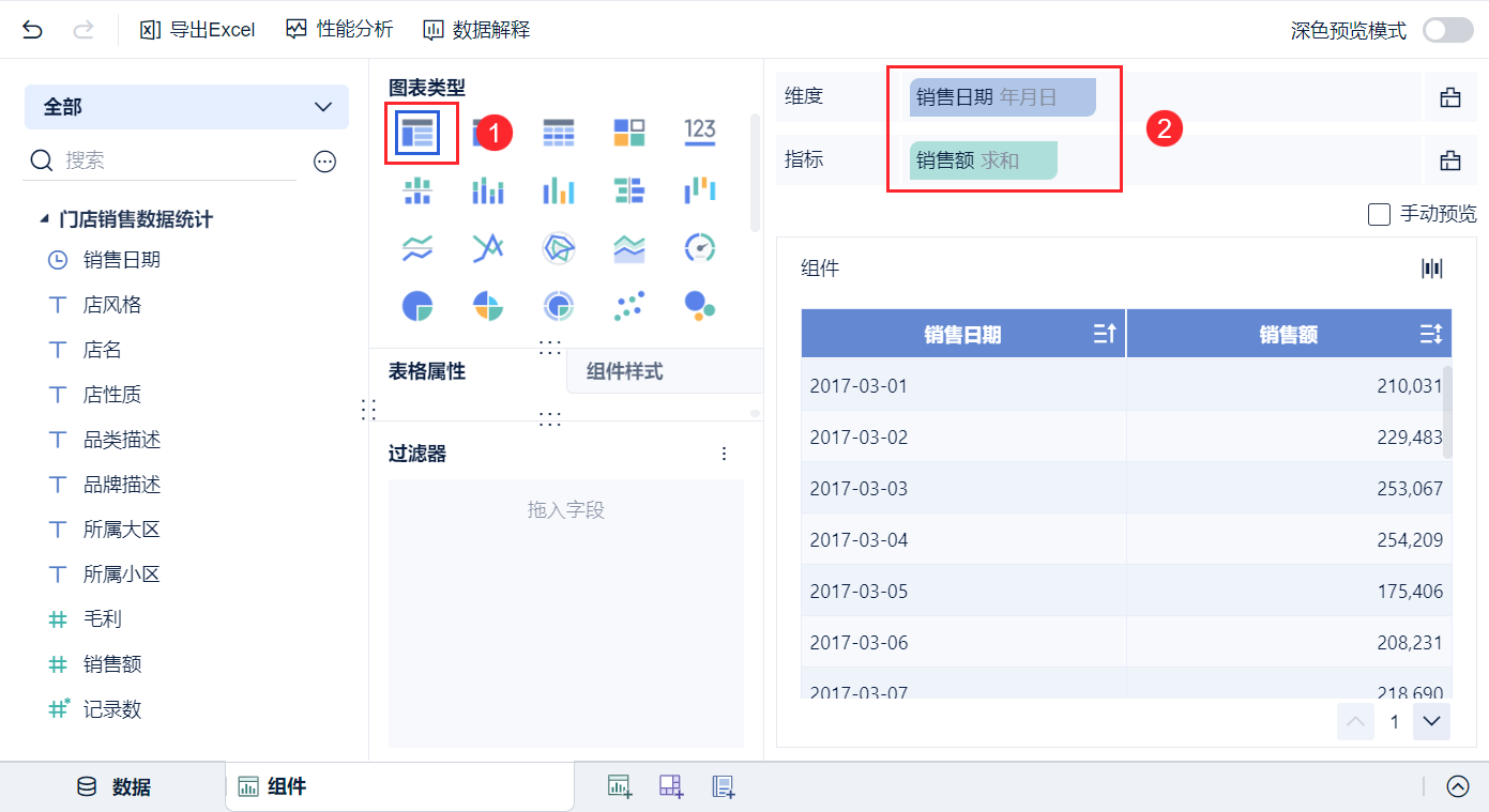 添加分组表:将「销售日期」和「销售额」分别拖入维度栏和指标栏。
