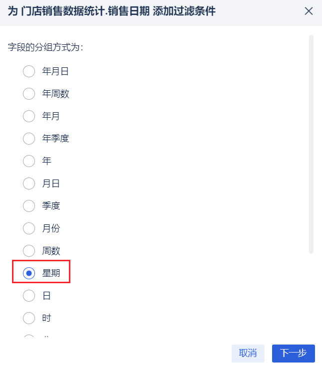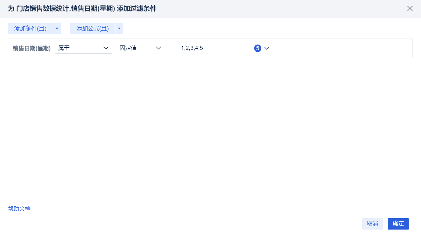 设置过滤条件:对「销售日期」进行过滤,选择过滤条件为销售日期属于「1,2,3,4,5」,即只保留工作日的数据。