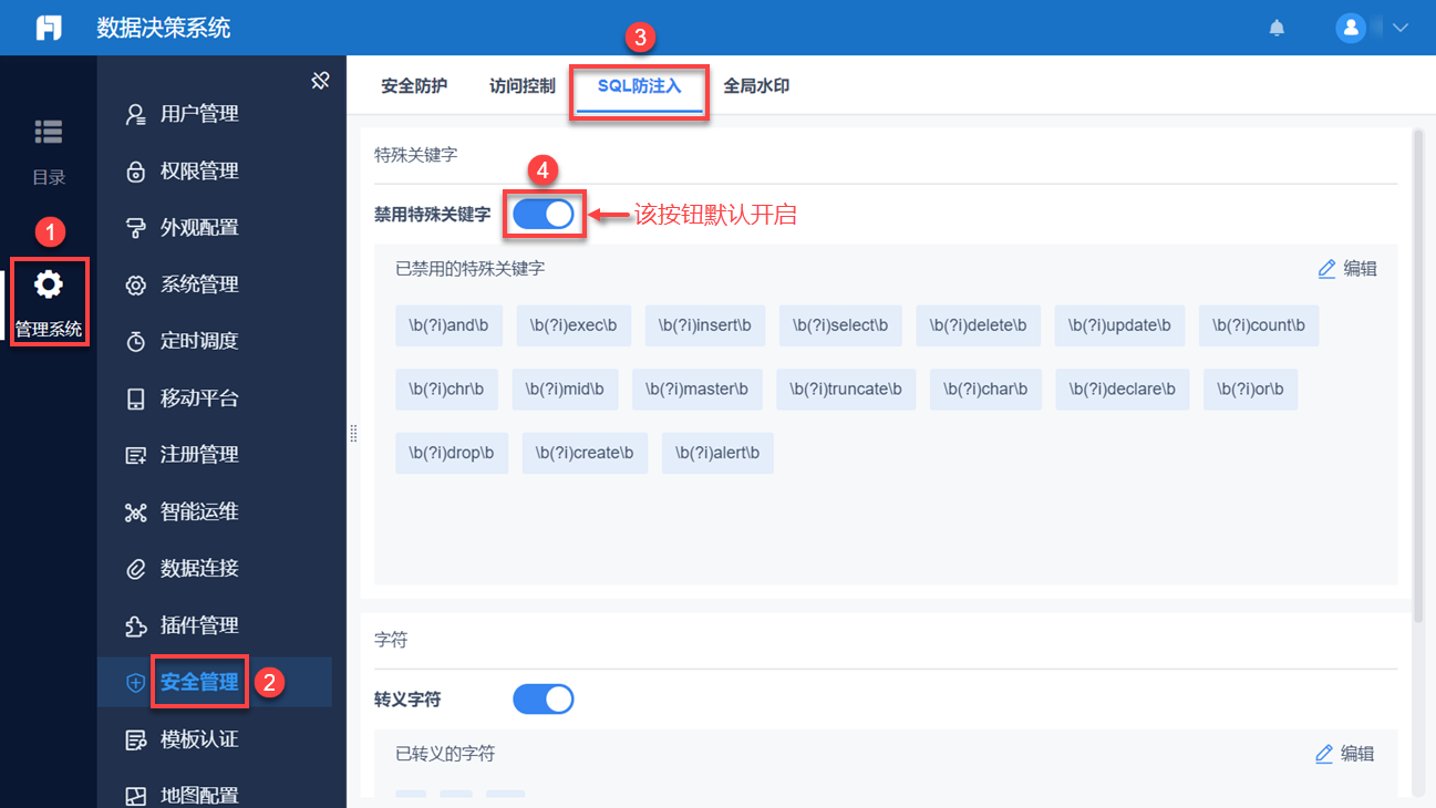禁用关键字是禁用参数里面的关键字吗。比如数据集里面的sql是这样的,对那应该是对参数abc 和 a 进行判断是否含有禁用关键字是吗 SELECT 销售员,sum(销量) as 销售总额 FROM 销量 where id = ${abc} and if (len(a)>0,"","t.base=" + a) group by 销售员 情况:有遇到两张报表用的参数一样,然后禁用关键字里面有and,但是一张报表可以,另一张不可以。把禁用关键字and取消掉,不可以的报表也可以了。 |